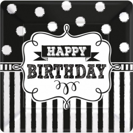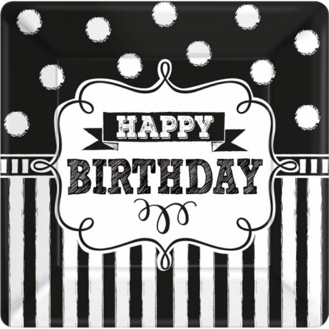 Pratos grandes quadrados da coleção Chalkboard Birthday destinada a adultos e adolescentes em tons brancos e
