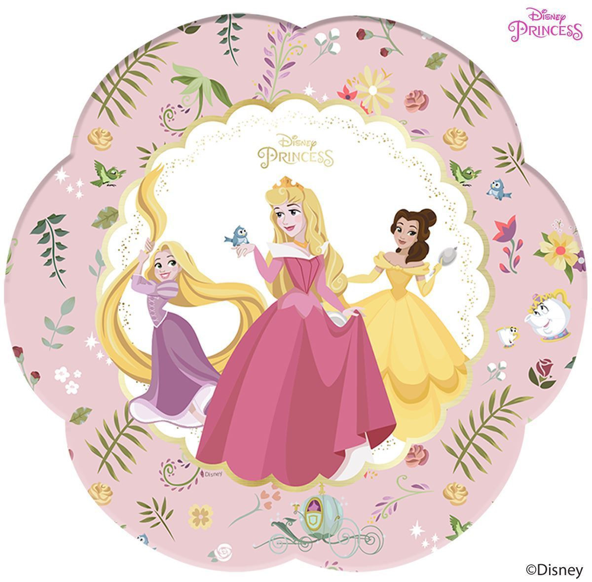 Conjunto de quatro pratos da coleção mais requintada das Princesas Disney, denominada True Princess. Estes pratos recortados em forma de flor têm detalhes dourados e fazem uma festa absolutamente única e esplendorosa.