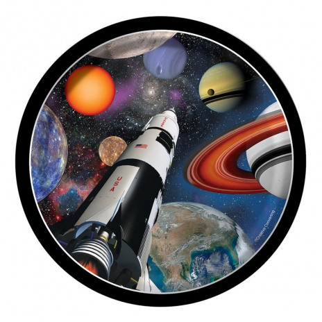 Conjunto de 8 pratos de papel com 17 cm de diâmetro com ilustrações do Espaço, para tornar a tua festa de aniversário ainda mais divertida.