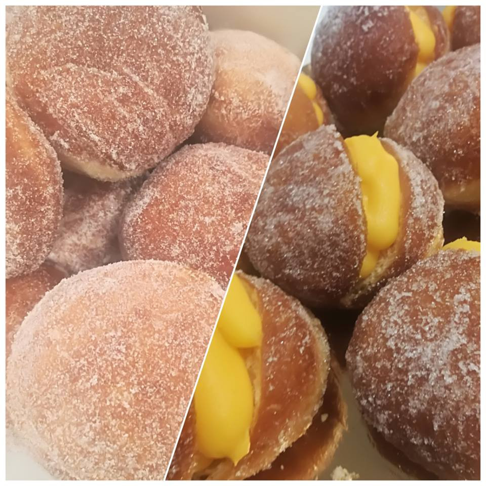 Dissolva a levedura com a água morna. Junte ao preparado e aos ovos, e bate à velocidade alta até obter uma massa homogénea e elástica. Estenda a massa a uma altura aproximada de 1-1,5 cm de altura e corte em círculos com um aro. Coloque num tabuleiro com papel vegetal untado e deixe levedar até triplicar de volume. Frite em óleo a temperatura média até ficarem dourados em ambos os lados. Passe em açúcar ainda quentes. Depois de frios recheie ao seu gosto.
