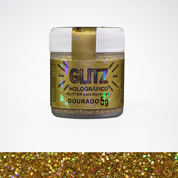 O Glitz Holográfico Dourado é conhecido como o glitter 3D, este efeito que imita o fenómeno que acontece nos nossos olhos, como um cristal que reflete diversas cores ao ser atingido pela luz do sol. Dependendo do ângulo ele, muda a cor, dando a impressão de arco-íris, e neste caso dando matizes de dourado! Indicado para dar acabamento e revestimento em bolos, chantilly, pasta americana e muito mais!