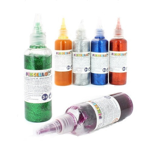 Frasco com 80 gramas de purpurinas com cola para decoração de balões e afins, disponível em azul, cor de laranja, prateado, roxo, verde e vermelho.