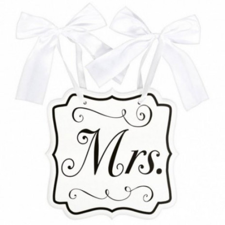 Uma placa em mdf para marcar o lugar e/ou sinalizar no dia do seu casamento em branco com a inscrição Mrs. Inclui lacinhos para prender à cadeira.