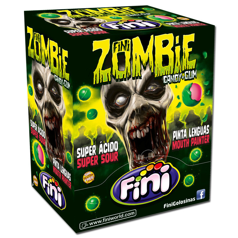 Os rebuçados de cor verde assustadores e recheados com uma deliciosa pastilha de morango. Cada fini zumbi deixará a tua língua com uma cor esverdeada única.