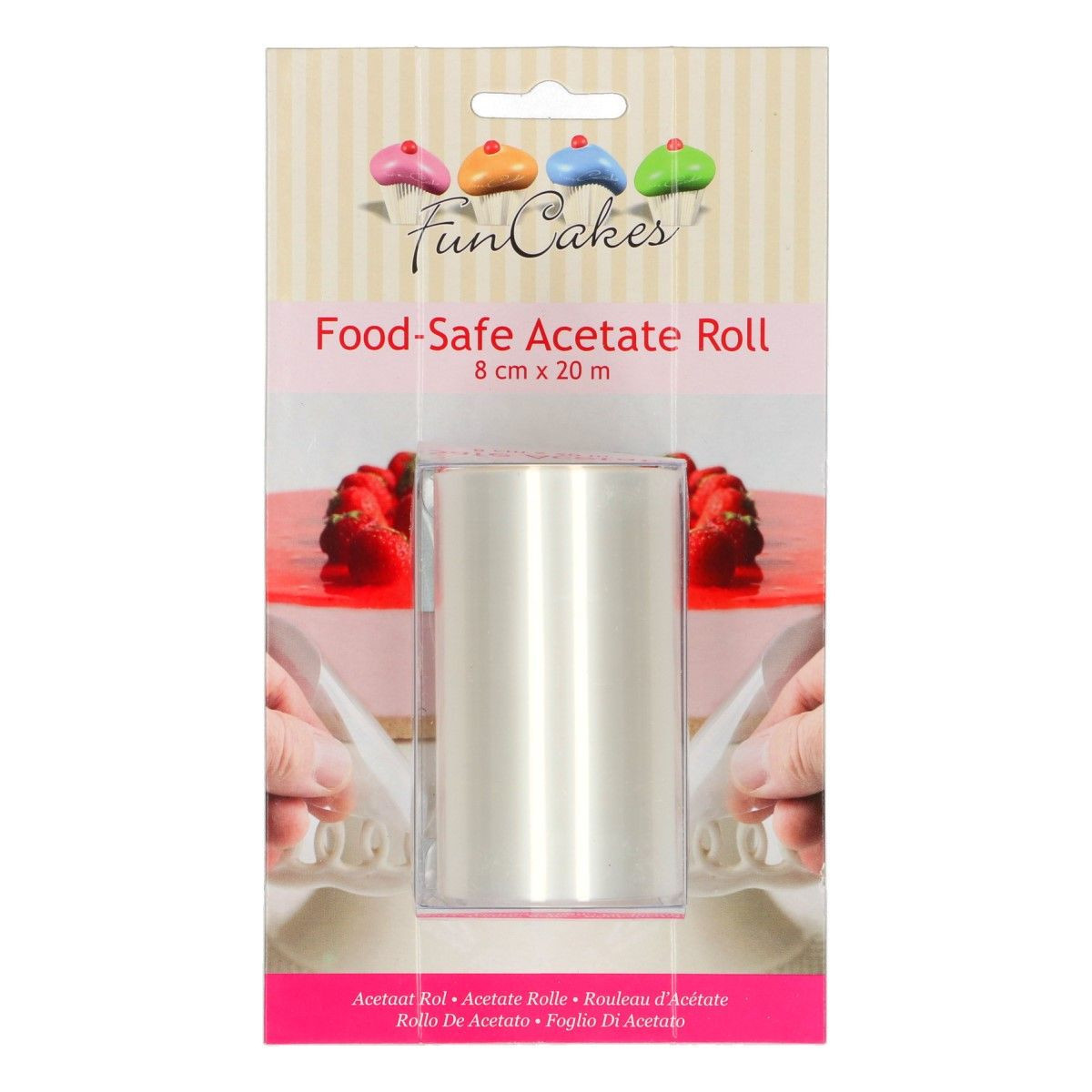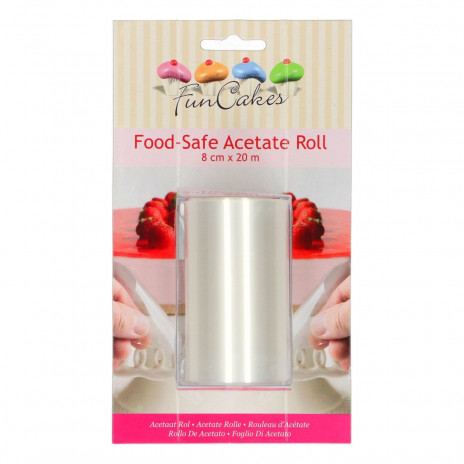 O rolo de acetato da FunCakes é uma folha de acetato segura para alimentos. O acetato é adequado para trabalhar com chocolate e fazer, por exemplo, bavarois e cheesecakes, e é fácil de cortar para vários fins.