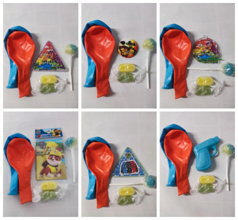 Saco transparente composto por dois balões latex, dois rebuçados, um chupa e um brinde.