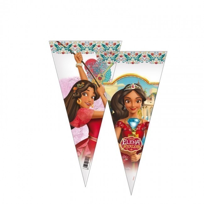 Saco em formato cone com a imagem da Elena de Avalor para colocação de brindes das festas de aniversário. Dimensões: 20 x 40 cm