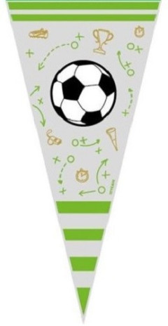 Saco em formato cone com a imagem de futebol para colocação de brindes das festas de aniversário.