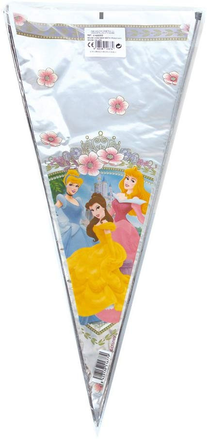 Saco em formato cone com as imagens das Princesas Disney com imagens diferentes de ambos os lados com flores para colocação de brindes e doces para festas de aniversário.