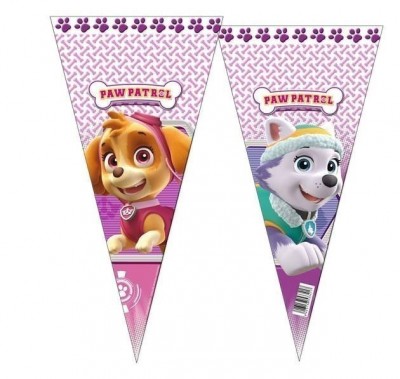 Saco em formato cone com a imagem das cadelinhas Skye e Everest da série Paw Patrol para colocação de brindes das festas de aniversário.