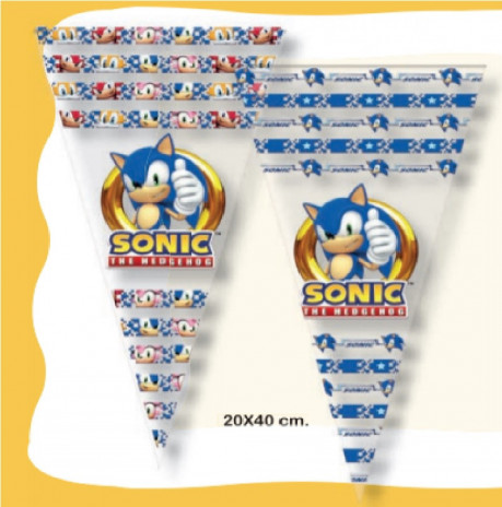 Saco em formato cone com a imagem do Super Sónic para colocação de brindes das festas de aniversário.