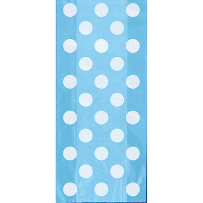 Pack de 20 sacos brinde em tom de azul e bolas brancas. Inclui ainda fitas prateadas para fechar embalagem