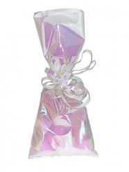 Embalagem com 10 sacos brinde iridescentes com um atilho para fechar.