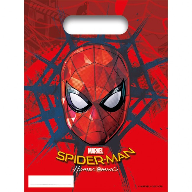 Pack de 6 sacos para colocar os brindes a dar aos amigos nas festas de aniversário do Homem Aranha.Coleção Home Coming do Spiderman.