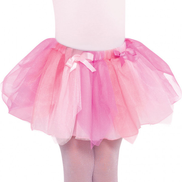 Uma saia tutu de fada rosa apresenta muitas camadas de tule transparente em vários tons de rosa sobrepostas umas às outras numa camada de cetim. É adequado para a maioria das crianças até aos 6 anos.