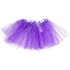 Uma saia tutu de fada que apresenta muitas camadas de tule em roxo sobrepostas umas às outras.
