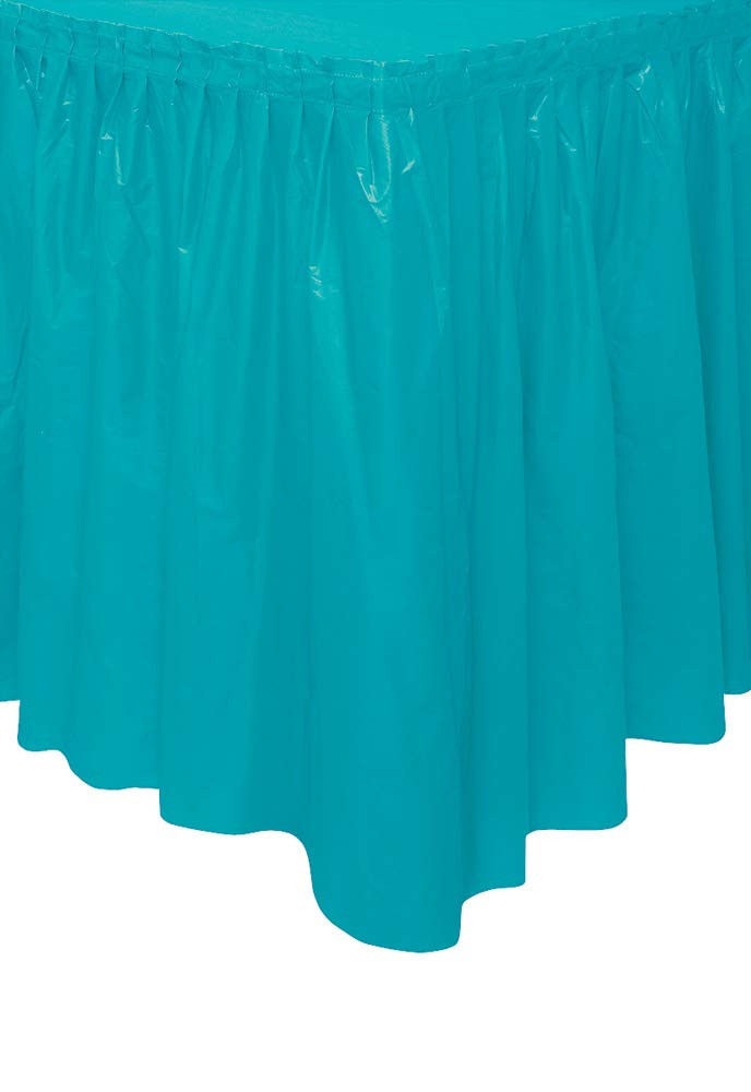 Saia de mesa plastificada na cor azul turquesa para decorar mesas de festas de aniversário ou outros eventos.