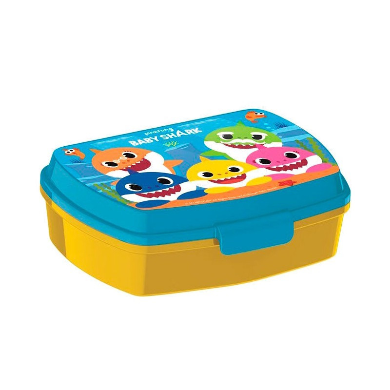 Caixa em pvc do Baby Shark, para transportar pequenos lanches em tons de azul e amarelo com as personagens do momento.