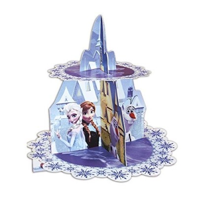 Suporte para os cupcakes em tons de azul, com as irmãs Frozen e Olaf. Torna a tua festa de aniversário verdadeiramente linda e especial com esta torre de 2 andares muito elegante e original.