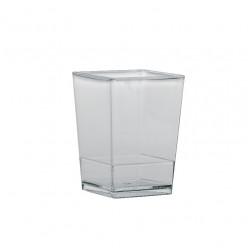 Copo de sobremesa ou de entradas quadrado transparente com tampa com capacidade para 60ml. Com as medidas, 4x4cm e 5.5cm de altura.