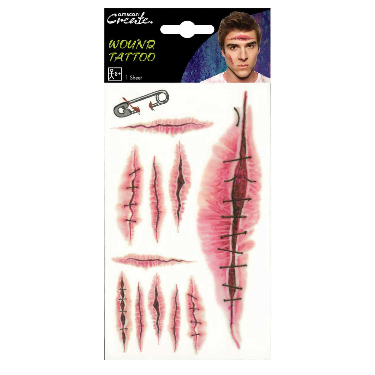 Folha de tatuagens com golpes e cicatrizes para caracterização em festas como Halloween e outras.