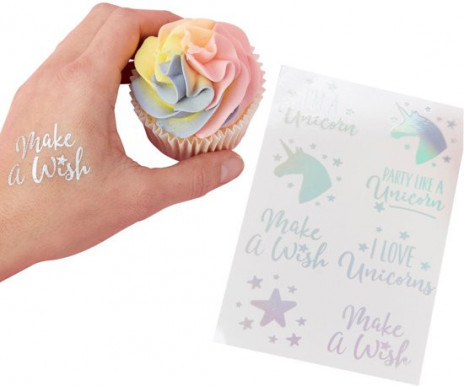 As tatuagens unicórnios iridescentes farão com que todos sintam as vibrações mágicas do unicórnio! Em forma de estrelas, de unicórnio e até mesmo citações para dar a todos um toque mágico e místico à sua festa.