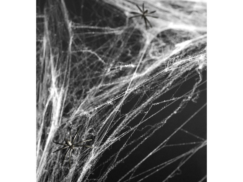 Para decoração da sua festa de Halloween, uma teia de aranha branca com duas aranhas pretas. É medonha.