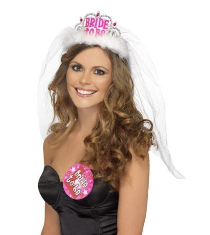 Para usar na sua despedida de solteira, uma tiara com véu com a inscrição "Bride to be" e vários brilhantes.