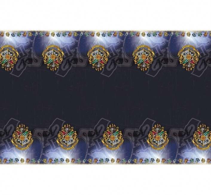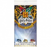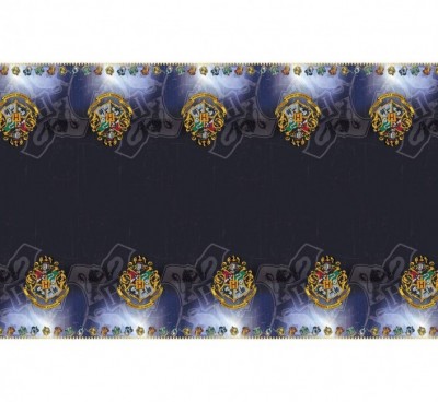Toalha de plástico com ilustrações alusivas às equipas da saga Harry Potter, para a decoração da mesa da festa de aniversário Medida aproximada: 2,13 m x 1,37 m