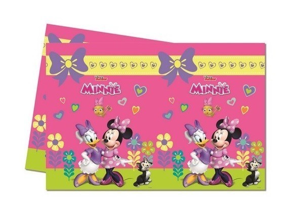 Toalha plástica com ilustrações da Minnie Mouse Disney e suas amigas para a decoração da festa de aniversário.