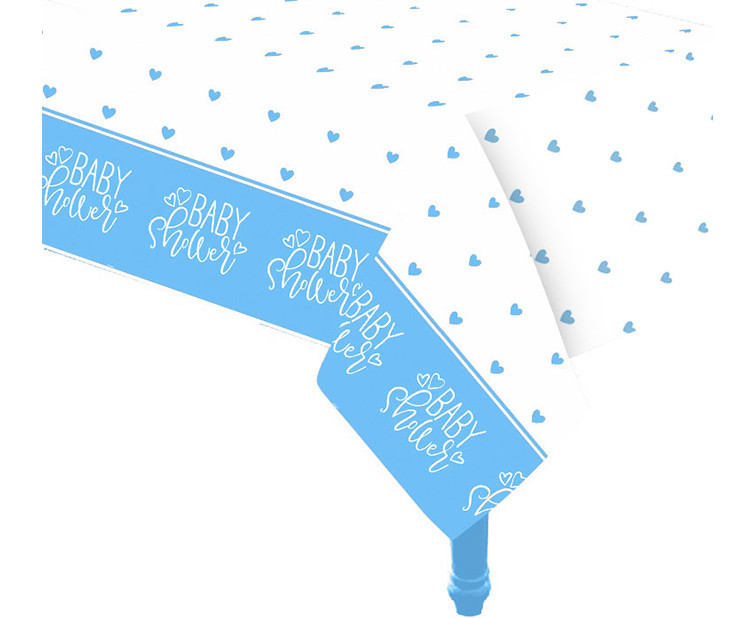 Toalha de mesa para festa em plástico,em tons de azul e branco com corações, para decoração de baby shower, chá de bebé.