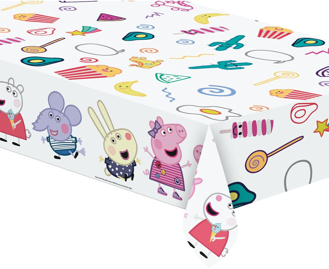 Toalha de plástico da Porquinha Peppa, para festas temáticas de aniversário com as dimensões de 120x180cm. Ideal para decorares a tua festa.