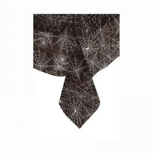 Toalha de plástico na cor preta em formato retangular com teia de aranha em preto para adornar a sua mesa de festa de halloween. Também ótima para festas Spiderman (Homem-Aranha), Góticas ou Vampirina.