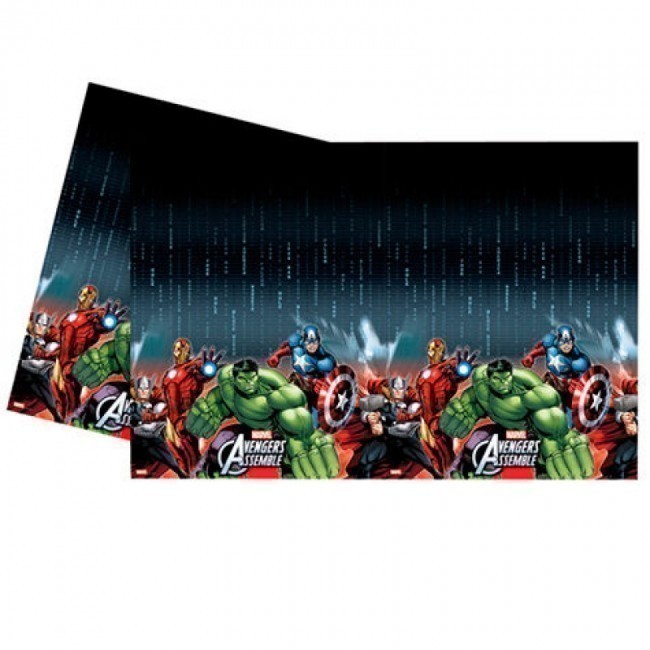 Toalha de mesa plástica para as festas de aniversário do tema Avengers Marvel Assemble.Medidas aproximadas: 120 x 180 cm