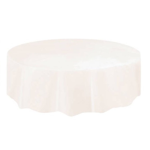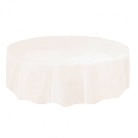 Toalha de plástico em formato redondo de cor marfim.