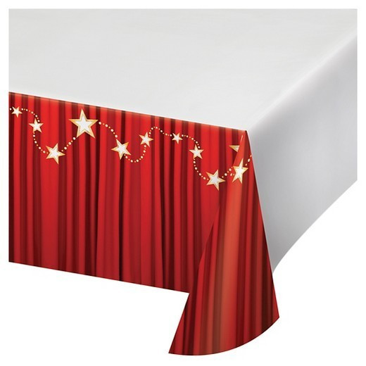 A toalha de plástico mede 137cm x 259cm e possui um maravilhoso desenho impresso de borda de cortinas vermelhas e estrelas brilhantes.