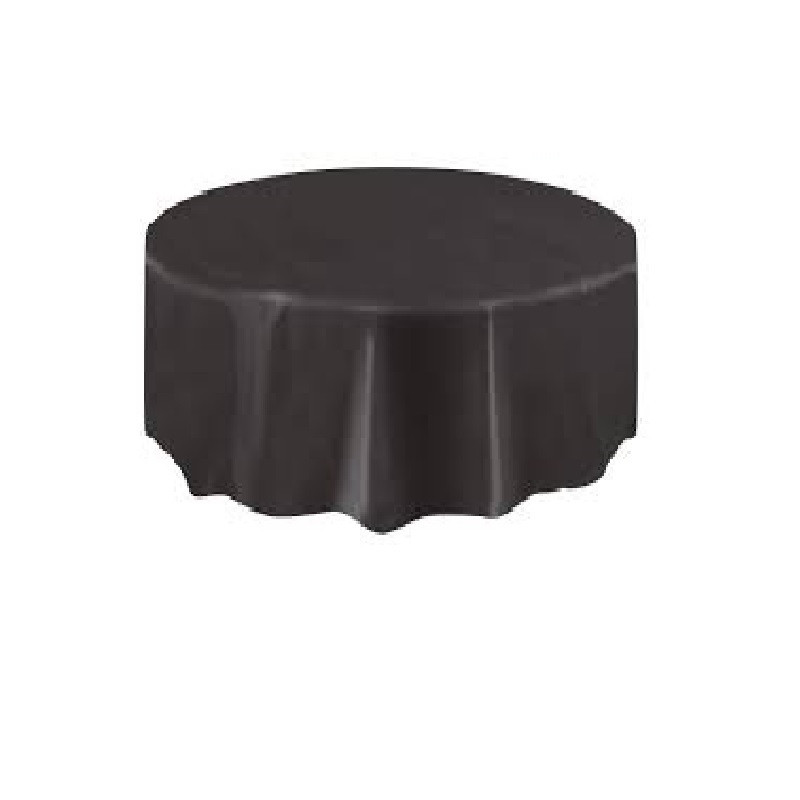 Toalha de plástico de formato redondo de cor preta, ideal para a tua festa de Halloween, ou qualquer outro evento temático.