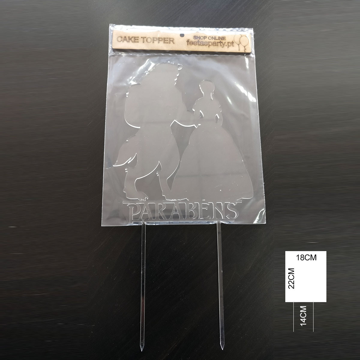 Topper em acrilico transparente inspirado no filme Disney A Bela e o Monstro para decoração de bolos de aniversário.
