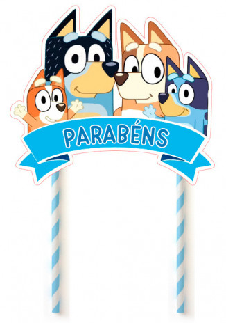 Topper ou topo para bolo do tema Bluey. Pode personalizar o texto, indique nas observações no fecho da encomenda. Senão indicar será utilizado por defeito «Parabéns».