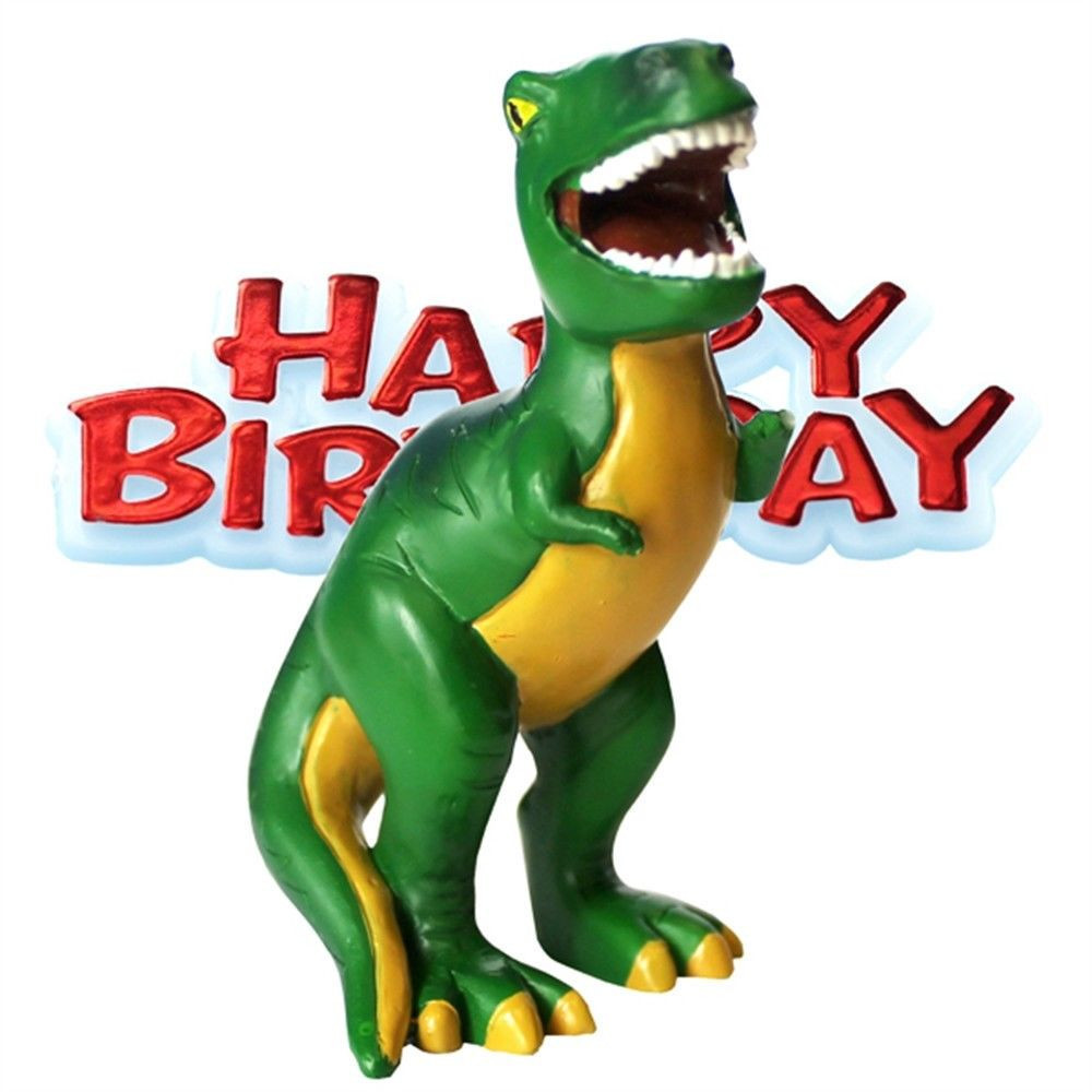 Conjunto de topper em plástico com a inscrição Happy Birthday e figura decorativa em resina de Dinossauro. São laváveis e reutilizáveis.