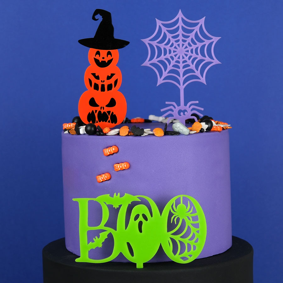 Topper de bolo acrílico cor preta com espessura de 3 mm, ideal para decoração de bolos de halloween.