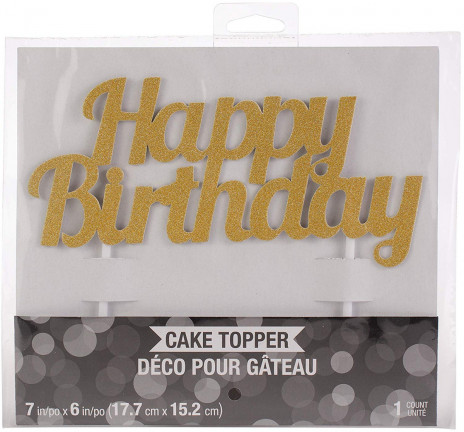 Topper dourado para bolo de aniversário. Contém a palavra inscrita "Happy Birthday", com letras brilhantes.