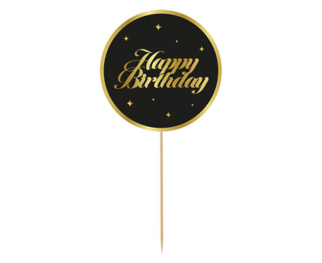 Topper para bolo de aniversário em preto com estrelas em dourado. Contém a palavra inscrita "Happy Birthday".