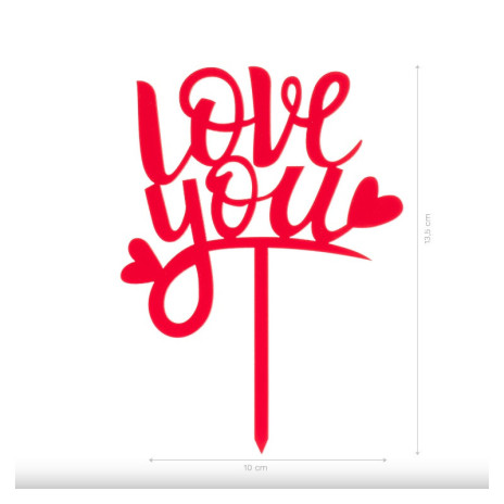 Topper em acrílico vermelho para bolo de festa de casamento ou dia dos namorados. Contém a palavra inscrita "Love You".
