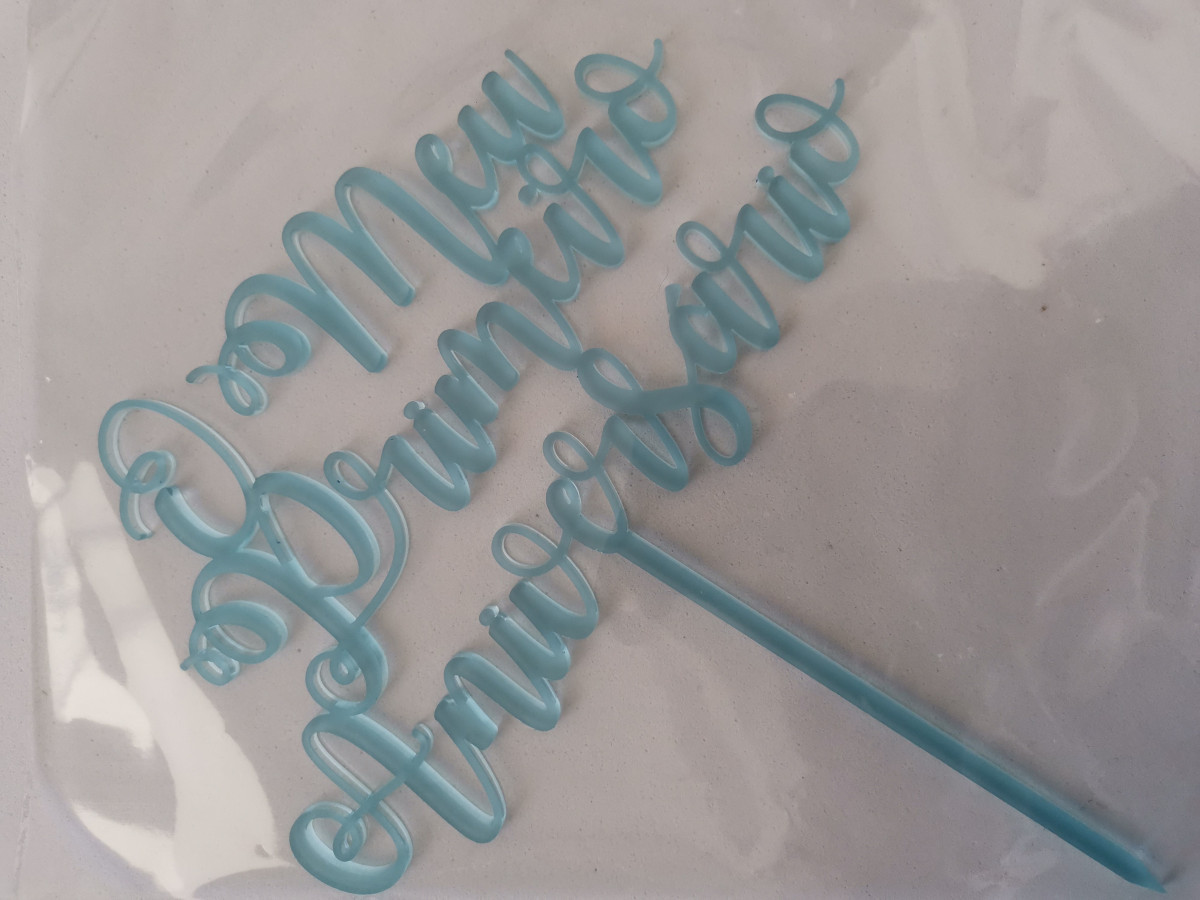 Topper em acrilico azul com a inscrição "O Meu Primeiro Aniversário".