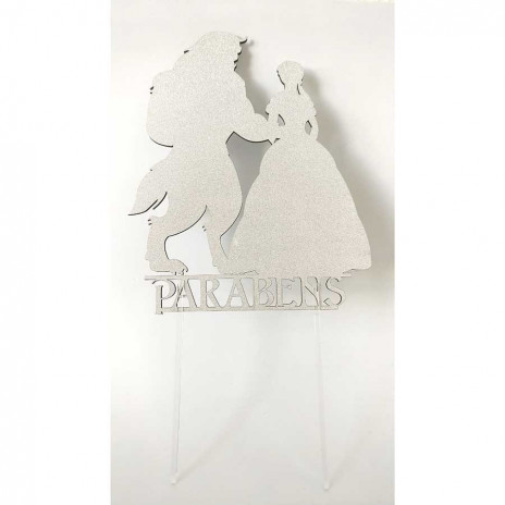 Topper Bolo Parabéns Bela e o Monstro Prateado Glitter