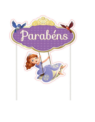 Topper ou topo para bolo do tema da Princesa Sofia. Pode personalizar o texto, indique nas observações no fecho da encomenda. Senão indicar será utilizado por defeito «Parabéns».