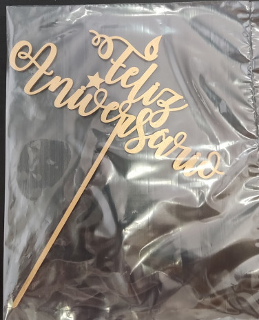 Topper ou topo para bolo de anos com as palavras Feliz Aniversário,uma chama de vela e uma estrela na cor dourada. Artigo resistente fabricado em MDF ideal para qualquer festa de aniversário.