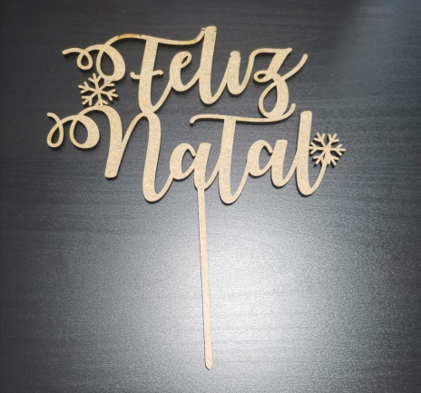 Topper ou topo para bolo com as palavras Feliz Natal, com dois flocos de neve em mdf cru. Artigo resistente fabricado em MDF ideal para decorar a sua mesa de natal.