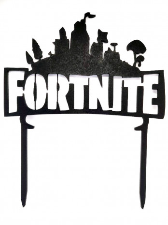 Topper ou topo para bolo de aniversário Fortnite resistente fabricado em MDF e na cor preta. O elemento que não pode faltar nos bolos de todos os jogadores Fortnite Battle Royal ou de outras versões.